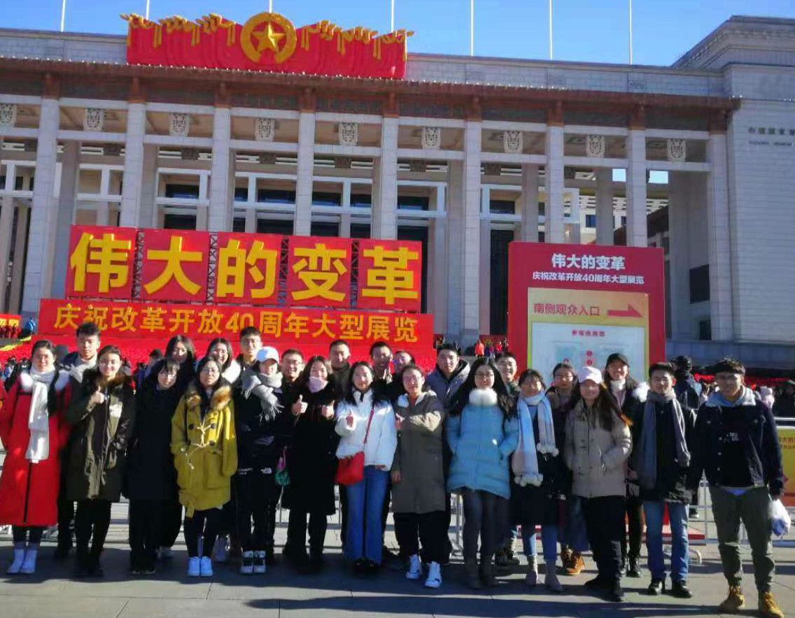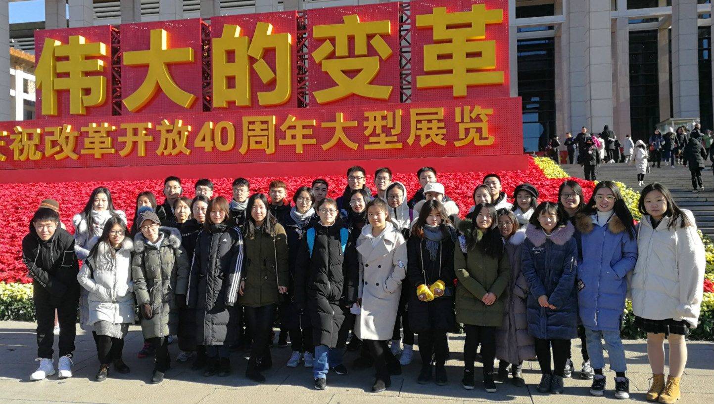 一上午的参观让同学们开阔了视野、增强了家国情怀、认清了自己的使命担当。参观结束后,同学们在 “伟大的变革——庆祝改革开放四十周年大型展览”展板前合影留念。