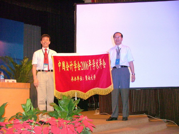 孟焰院长与下届年会承办单位暨南大学副校长王华教授交接承办锦旗