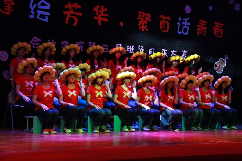 在2011级学生会代表们献上的美丽优雅的华尔兹下,本届班级风采大赛正式拉开了帷幕。此次大赛中2012级5个班以“北京遇上你我他”为主题制作班级宣传视频,设计班级风采节目展示。同学们制作的班级广告内容多样,主题丰富,充分展示了近一年来班级的融合与进步;节目的展示更是形式多样,不仅有活力的舞蹈,动人的合唱,也有以大学生活为原型创作的话剧表演,向大家展示了2012级同学近一年来的大学生活的真实写照。其中2012级国际管理会计班的同学们,以向日葵保卫战作为背景,同时结合多段活力四射的舞蹈,展示了大学生的蓬勃朝气。节目中,化身为向日葵的同学们整齐划一的表演,与男生女生默契的舞蹈配合,都得到了嘉宾评委和观众们的一致好评。