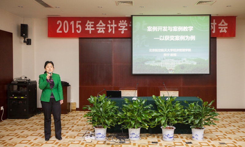 北航经管学院副院长周宁教授向参会教师重点介绍了北航经管学院的案例开发的制度建设、案例教学开发的国际模式、获奖案例开发与教学心得体会以及案例开发资源的积累等详细情况。周宁教授先后获得全国百优案例、哈佛大学麦克法兰案例奖、全国MPAcc优秀案例等多项大奖。她以获奖案例《谁才是明星产产品:转包产品成本核算的陷阱》为例,从案例选题、团队组建、写作过程控制等方面详细阐述了自己的经验体会,指出好案例标准应该是“故事一口气读完,分析发人深省”。