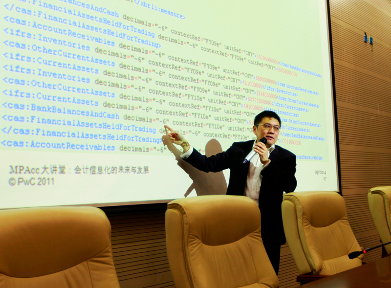 季老师分别介绍了信息化及其内涵、美国证券交易委员会的会计质量模型(Robocop)、可扩展商业报告语言“XBRL”等内容。季老师为同学们重点讲解了XBRL的概念和它在国内外的发展过程,并通过生动具体的示例展示出其在优化财务报告流程方面发挥的作用,使同学们形象化地感知到信息化在会计领域的巨大变革。