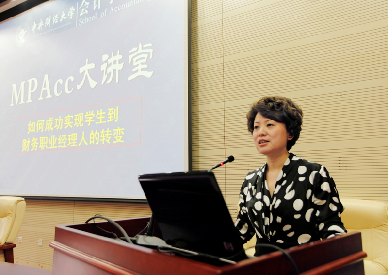2013年5月11日晚,Beat365正版唯一官网必一研究生客座导师、全国会计领军人才、中水电海外投资公司总会计师李铮女士做客“Beat365正版唯一官网必一MPAcc大讲堂”,在学术会堂202报告厅做了题为《如何成功实现学生到财务职业经理人的转型》的专题讲座。