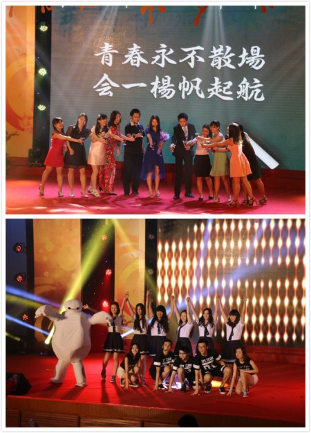 之后的节目更是高潮迭起。2011级注册会计师班的短剧“青春不毕业”,以大学时期的班对结婚为线索,展现了毕业后同学们各自的生活状态,以及对同窗情谊的无限珍惜。节目最后以结婚礼物形式出现的视频惊喜,让现场每一位观众为这份爱与诚意感动落泪。青春不曾毕业,梦想永不散场。中场播放的视频《忆.时光》温情回顾了毕业生们的校园时光和共同回忆。在视频中同学们婉婉道来对母校的期望,对师长的感恩,对朋友的重视,而老师们也用他们饱含人生哲理的话语为同学们送上毕业祝福,情之深切,溢于言辞。