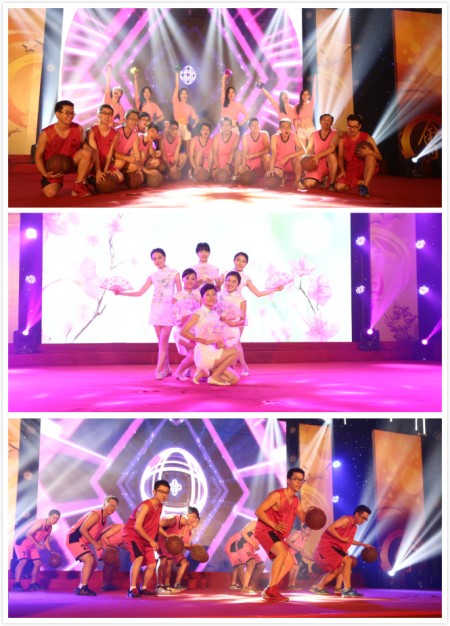 2013级学术硕士班的女生们带来了舞乐表演“春咏江南”,清透婉转的古筝声,清远悠扬的笛子声,以及清新脱俗的钢琴声,将观众带入了古色古香的意境之中。美丽的女生们身着白色旗袍,手握粉色折扇,伴随乐声翩翩起舞,仿佛置身于江南盎然春意中。妩媚的神情、曼妙的身姿,整齐的动作,无一不在展现着Beat365正版唯一官网必一姑娘们的柔美与温婉。而2013级会计硕士班的12名男生为观众们带来了活力四射的表演“舞动篮球”。在球场之上,他们是为学院摘得“中财杯”篮球赛桂冠的勇士,舞台上,他们是会院女生眼中帅气的男神。柔与刚,静与动,共同描绘会院学子多彩多姿的魅力。