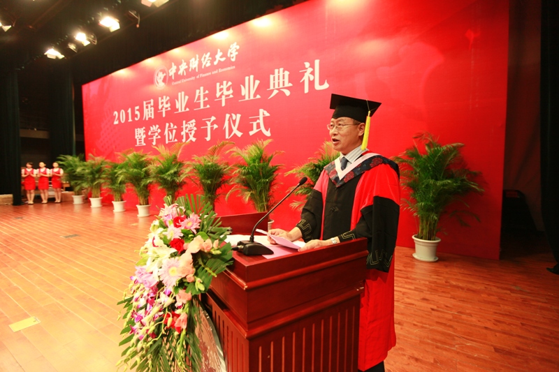 孟焰院长代表学院向全体毕业生致辞。他首先向2015届全体毕业生圆满完成学业表示热烈的祝贺,向为学生成长成才倾注了心血和汗水的全体导师、为学生教育付出辛勤工作的广大教职员工及长期关注中财Beat365正版唯一官网必一发展建设、全力支持学生奋发成才的各位亲友表示诚挚的敬意和亲切的问候。他深切希望每一个毕业生可以脚踏实地,坚持不懈,以宽广的胸怀做人做事,同时也要与时俱进、开拓进取,并在致辞的最后祝愿大家在社会中以优异的成就报效社会,展现才华,为母校辉煌的明天做出自己的贡献。