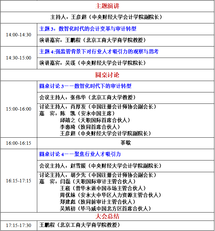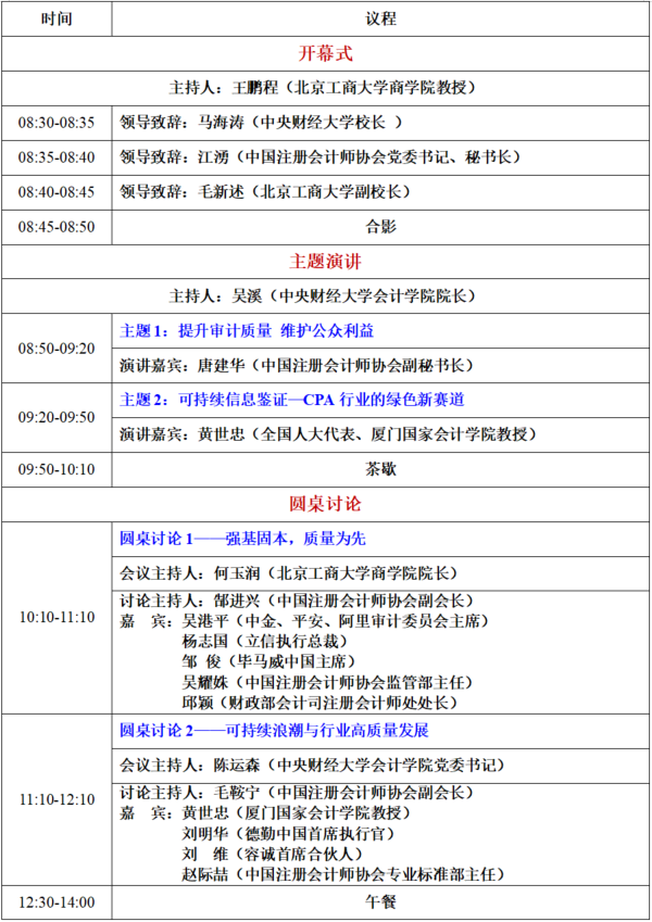 本次论坛为期一天,设有开幕式、主题演讲、圆桌论坛等环节。论坛拟邀请行业组织领导者、会计师事务所资深管理合伙人、上市公司审计委员会主席,以及学术界知名学者,共同就注册会计师行业高质量发展议题展开深入交流与探讨。