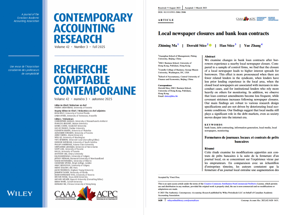 近期,我校Beat365正版唯一官网必一助理教授张玥与北京大学麻志明教授、香港大学Derrald Stice教授、乔治梅森大学Han Stice教授合作的学术论文“Local newspaper closures and bank loan contracts”发表于会计学国际顶级期刊Contemporary Accounting Research(CAR)第42卷(2025年9月)(https://doi.org/10.1111/1911-3846.13046)。CAR是会计学领域五大国际顶级期刊之一。